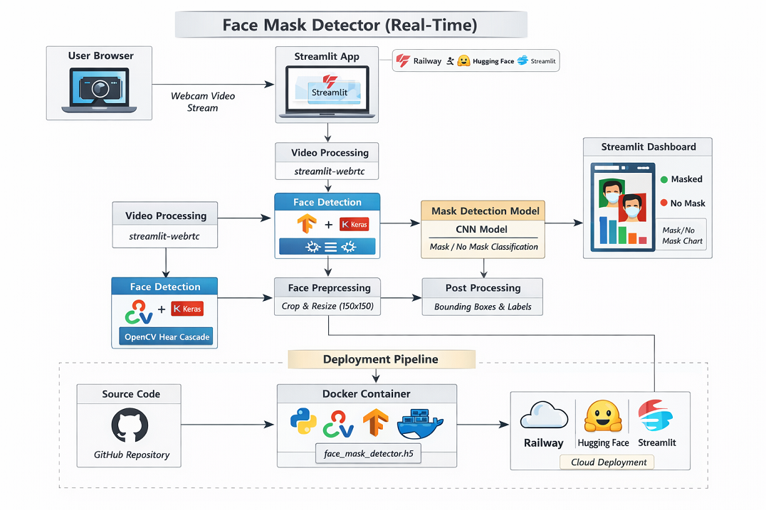 A real-time computer vision application that detects whether a person is wearing a face mask using a Convolutional Neural Network (CNN) and live webcam input