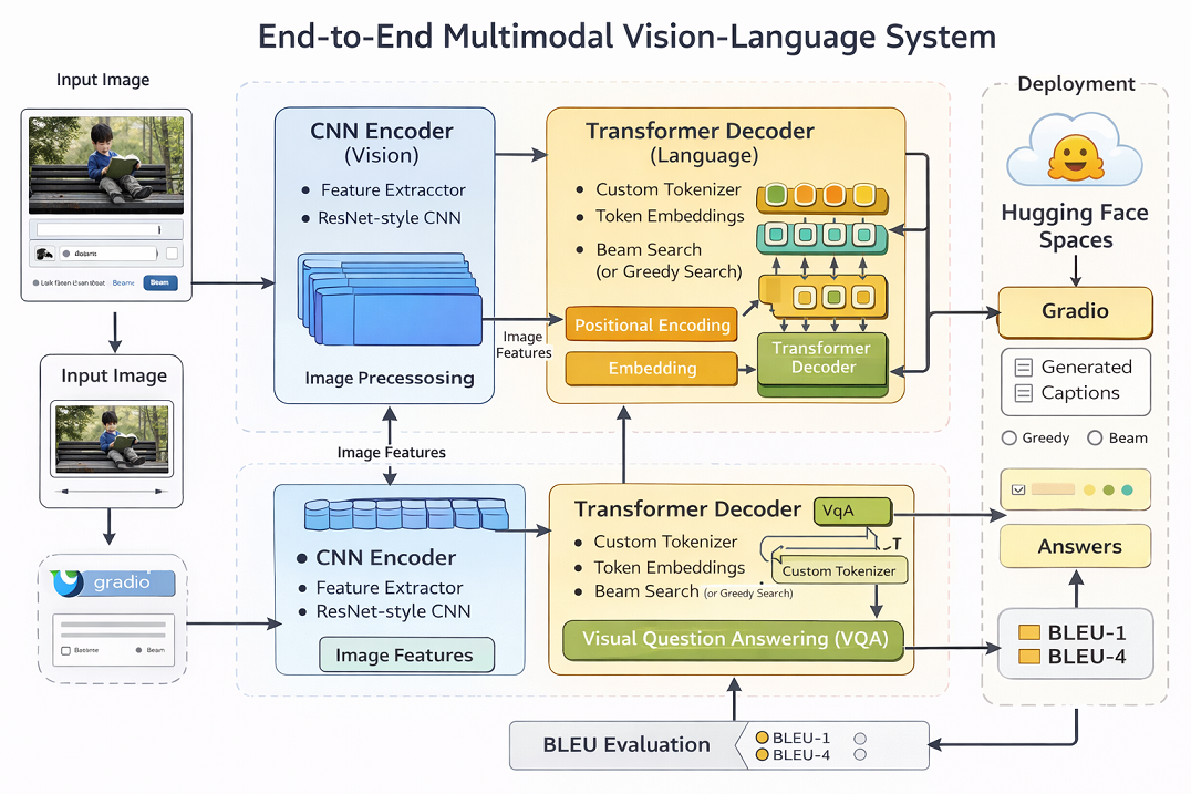 An end-to-end multimodal AI system that generates natural language descriptions of images and answers user questions about visual content using deep learning vision-language architectures