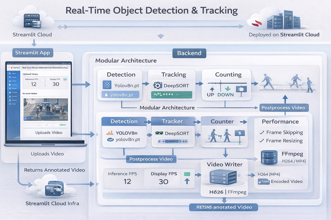 PythonOpenCVUltralytics YOLOv8DeepSORT / Custom TrackerStreamlitFFmpegStreamlit Cloud (Deployment)Performce Optimization