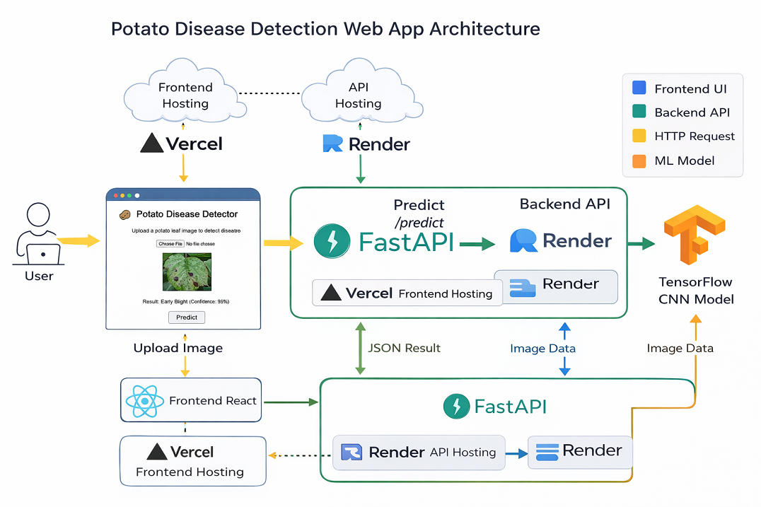 A cloud-deployed deep learning web app that detects potato leaf diseases using a TensorFlow model served through a FastAPI API and a React frontend
